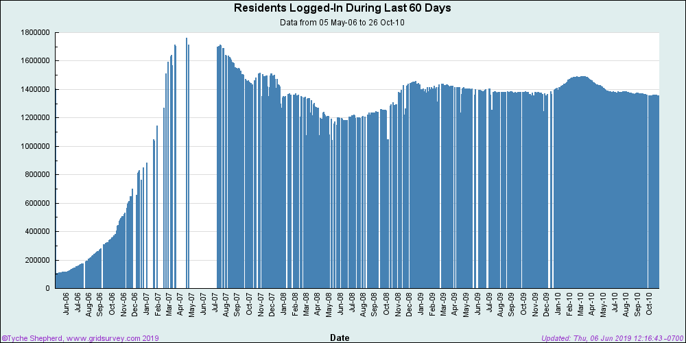 The beautifully designed website gridsurvey.com provides access to different databases of regions, incidents, Lindex Market data, economic metrics, and and clear graphics. Data and graphics are available from previous years and visitors can compare the development of Second Life according to different aspects, like users, land size, expenditure or business profits. Moreover, the recent and well crafted article "2009 Reviewed" of Second Life by Mr Ciaran Laval complements nicely all this data. Also developers can use the Gridsurvey APIs publicly available and under the Creative Commons Attribution 2.0 UK license.